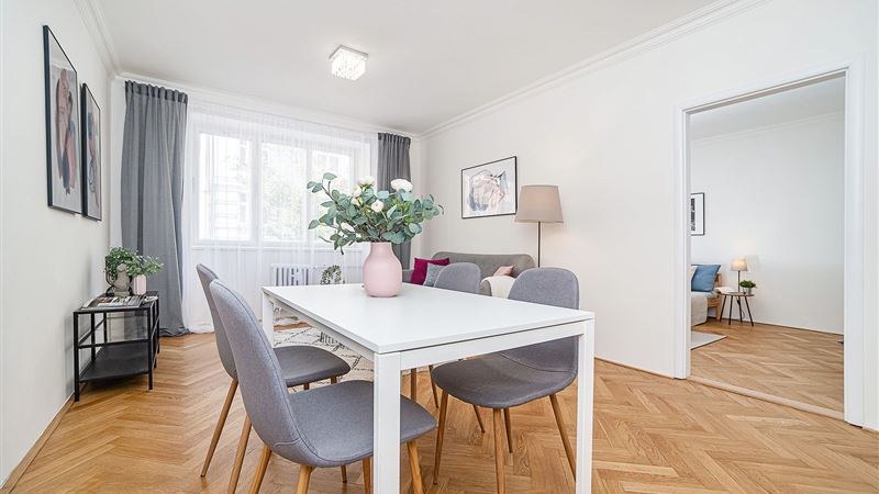Byt prošel kompletní rekonstrukcí zahrnující nové dřevěné parkety, dlažbu, obklady, nové rozvody elektřiny, vody a odpadu. Součástí rekonstrukce je také zcela nová kuchyňská linka.
